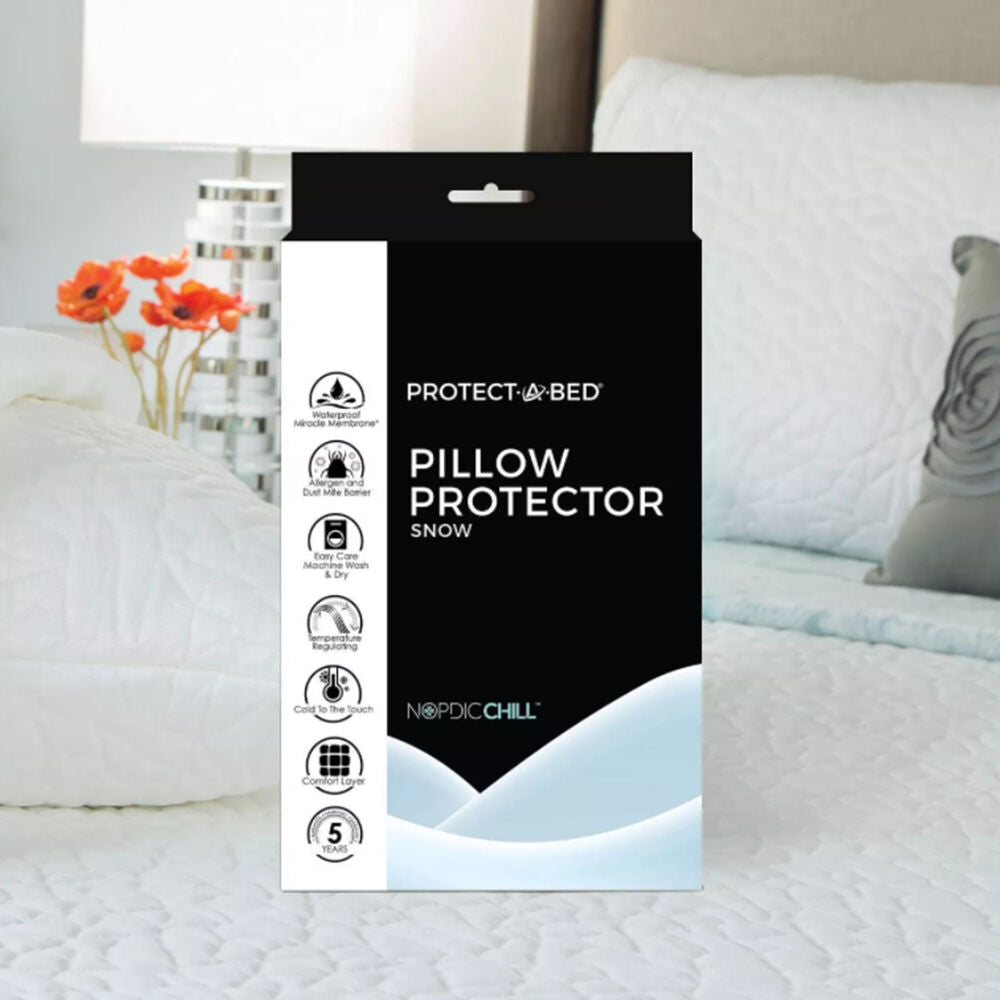 The Protect-A-Bed® Snow Cooling Pillow Protector has a innovated design to protect your pillow and keep it clean but also has the Nordic Chill cooling pillow cover fabric that can dissipate heat from skin up to 10 times faster than cotton, creating a cold sleep climate, even through a pillow case. The Miracle Membrane barrier promotes a healthy sleep environment by protecting you from dust mites and other allergens that may lurk in your pillow. Good Housekeeping quality tested and approved and backed with a 5 year manufactures warranty. You can rest easy and stay cool with The Protect-A-Bed® Snow Cooling Pillow Protector